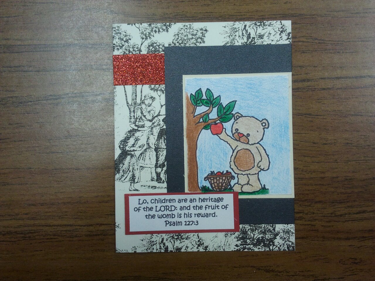 These cards were created using Recollections card stock, red glimmer paper from SU. I colored the Rhubarb Tree image, from Sweet n Sassy, with Crayola colored pencils. I am entering the cards in the Say It With Scripture 8 challenge, which can be found here